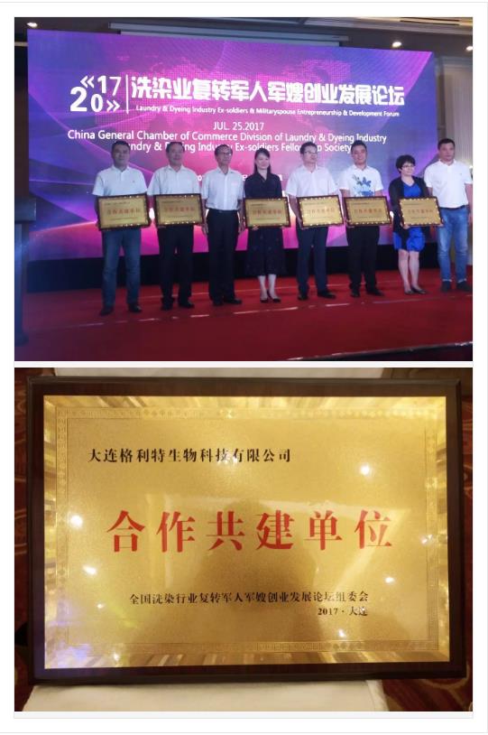 2017年7月25日洗染業(yè)復(fù)轉(zhuǎn)軍人軍嫂創(chuàng)業(yè)發(fā)展論壇曁軍人俱樂(lè)部聯(lián)誼活動(dòng)在大連圓滿結(jié)束。大連市洗染行業(yè)協(xié)會(huì)副會(huì)長(zhǎng)、大連市洗染行業(yè)協(xié)會(huì)公用紡織品辦公室主任、大連格利特生物科技有限公司董事長(zhǎng)延金祥先生上臺(tái)領(lǐng)取“合作共建單位”稱號(hào)獎(jiǎng)牌。